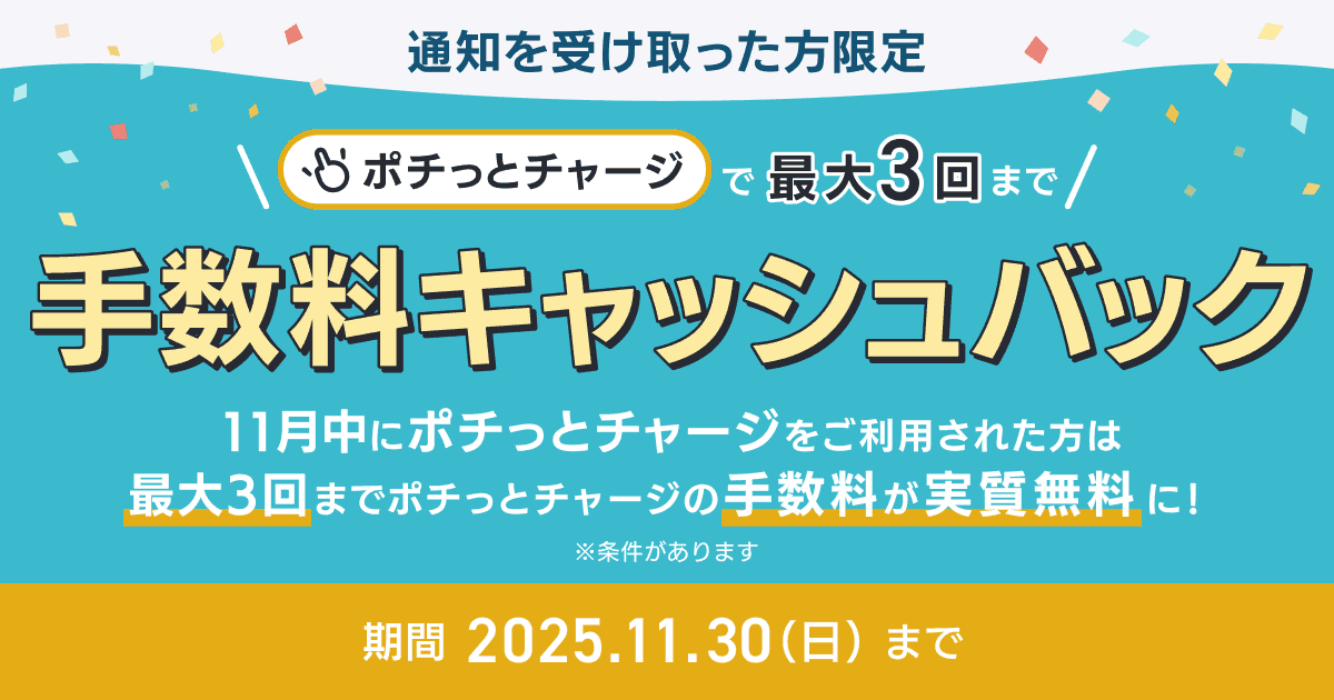 2025年11月中に初めて「ポチっとチャージ」をご利用のうえ、期間内にお支払いを完了した方全員に、最大3回分の手数料をキャッシュバック!